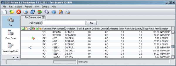El Fichero Maestro de Repuestos contiene datos relacionados a cada Repuesto. Dentro de la opción de crear/mantenimiento de Repuestos, el stock y detalles del histórico estan también disponibles.
