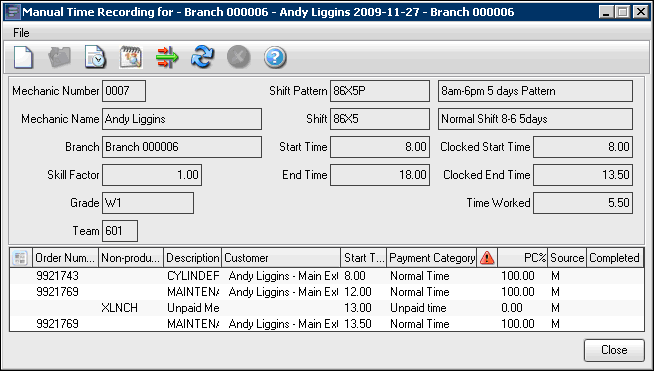 La Grabación Manual también está disponible en Plan Detalles Taller pulsando PedidoTiempo tomado en Pedido (botón derecho ).